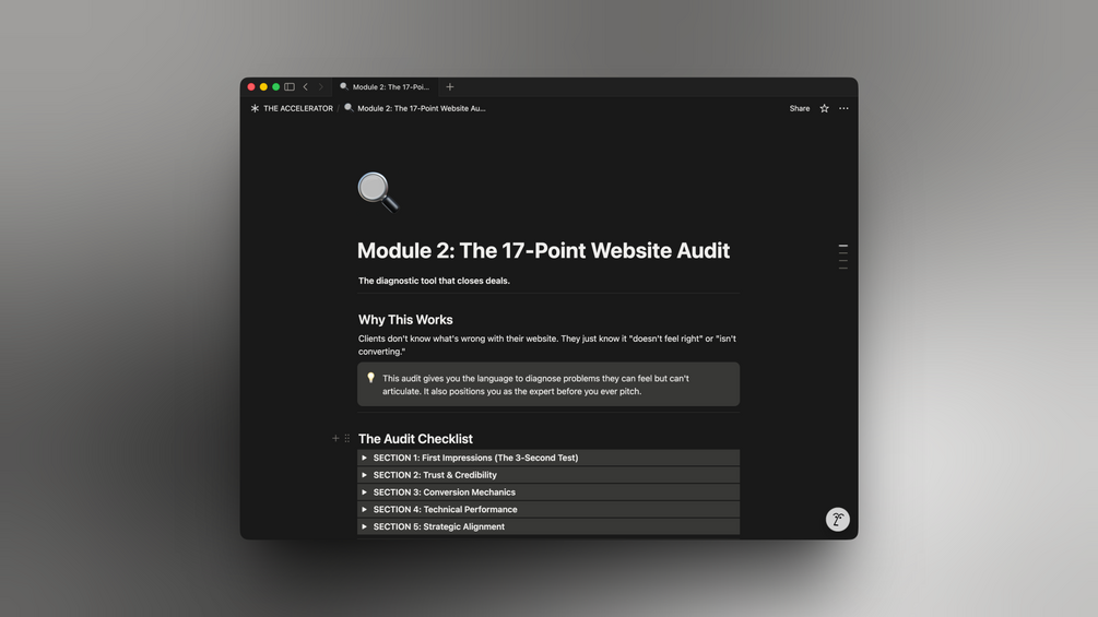 The 17-Point Website Audit The diagnostic tool that makes prospects sell themselves. Scoring system, revenue leak calculator, and how to present findings so clients feel the cost of doing nothing.